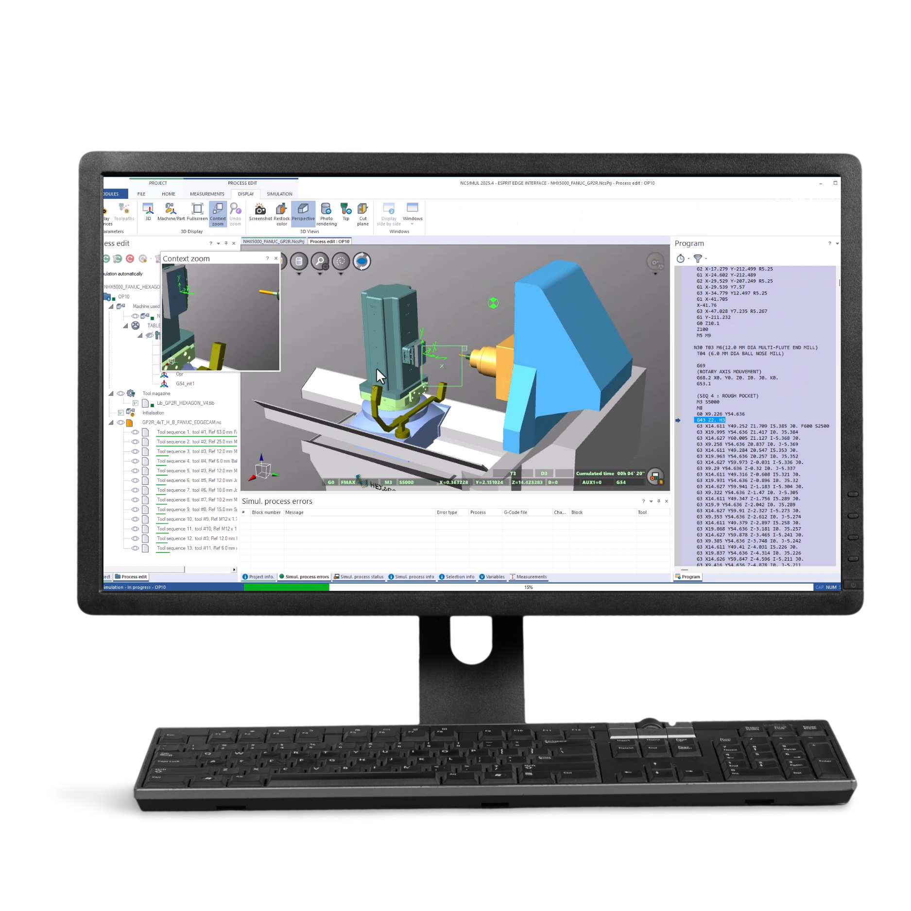 Configuriamo post-processor ufficiali HEXAGON, simulatori, attrezzaggi virtuali e ambienti CAM per fresatura, tornitura e multitasking.